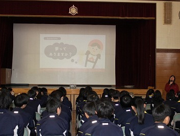 3月10日(火)、川西地区青少年健全育成協議会の事業として、合同会社とやま農場での活動をはじめ、サウナ事業や印刷関係等、様々な分野でご活躍されている 外山暁子 様を講師に迎え、「自分の好きを大切に生きよう」を演題にご講演をいただきました。好きなことの中に未来のヒントがあること、「大きな夢」がなくても、自分の「小さな好き」を大切にしていくことで、自分の夢につながることがあることなど、これから数多くの選択をしながら生きていく中学生にとって大切な考え方を伝えていただきました。中学生が自らの良さや可能性を認識し、未来を切り拓いていく力を身につけていくために、生徒はもちろん、教職員や保護者の皆様にとってもたいへん示唆に富むお話をいただきました。